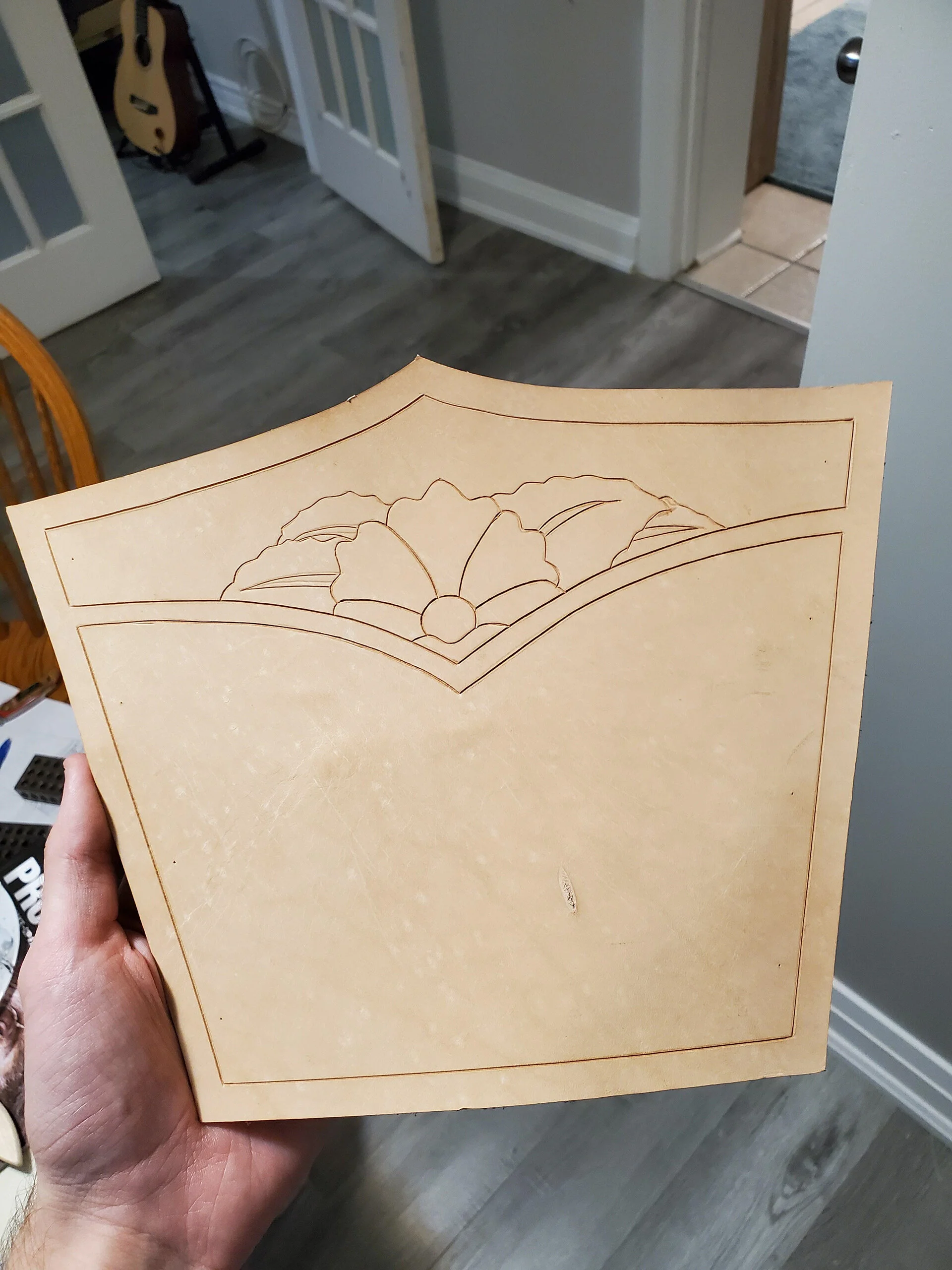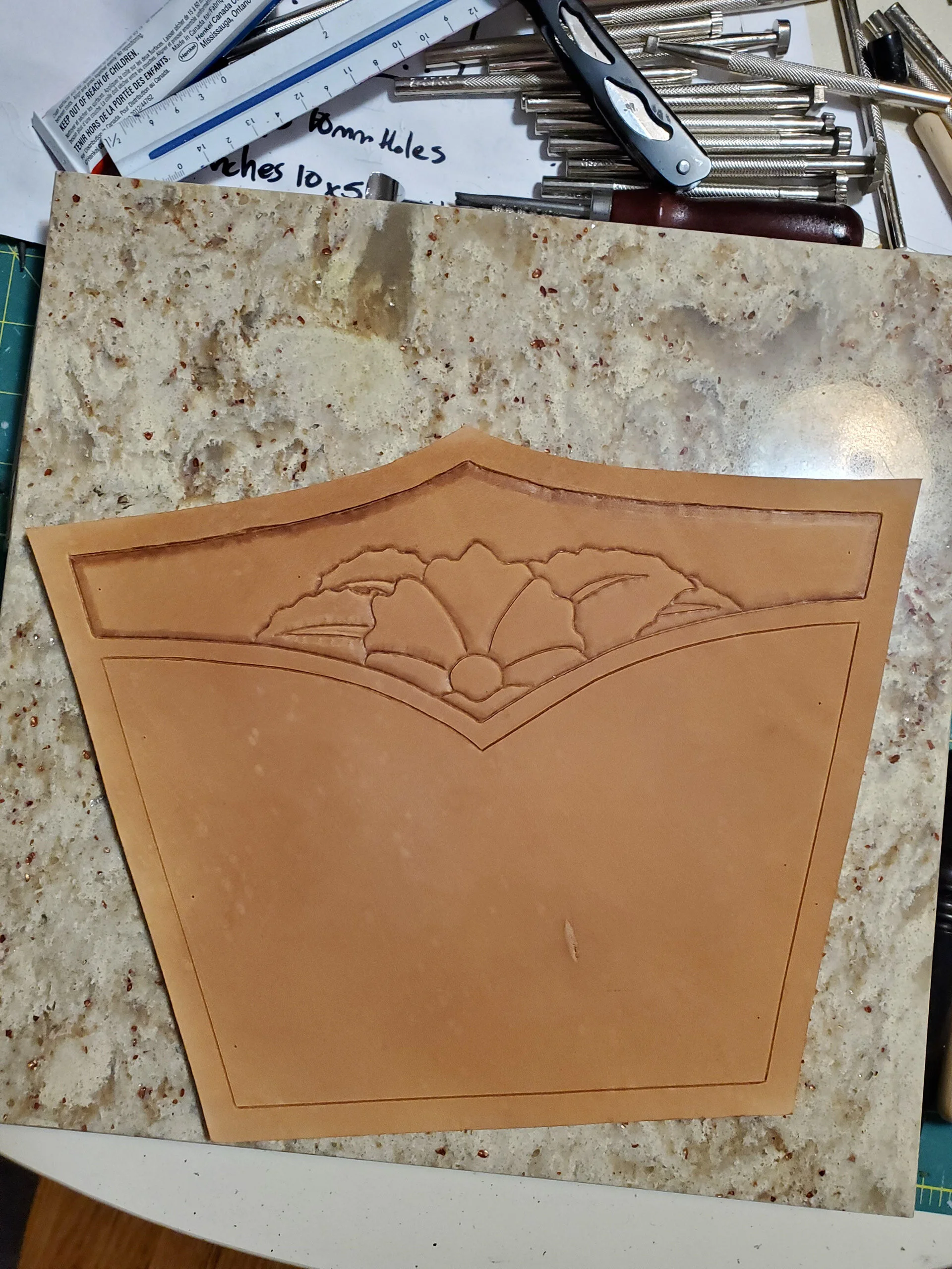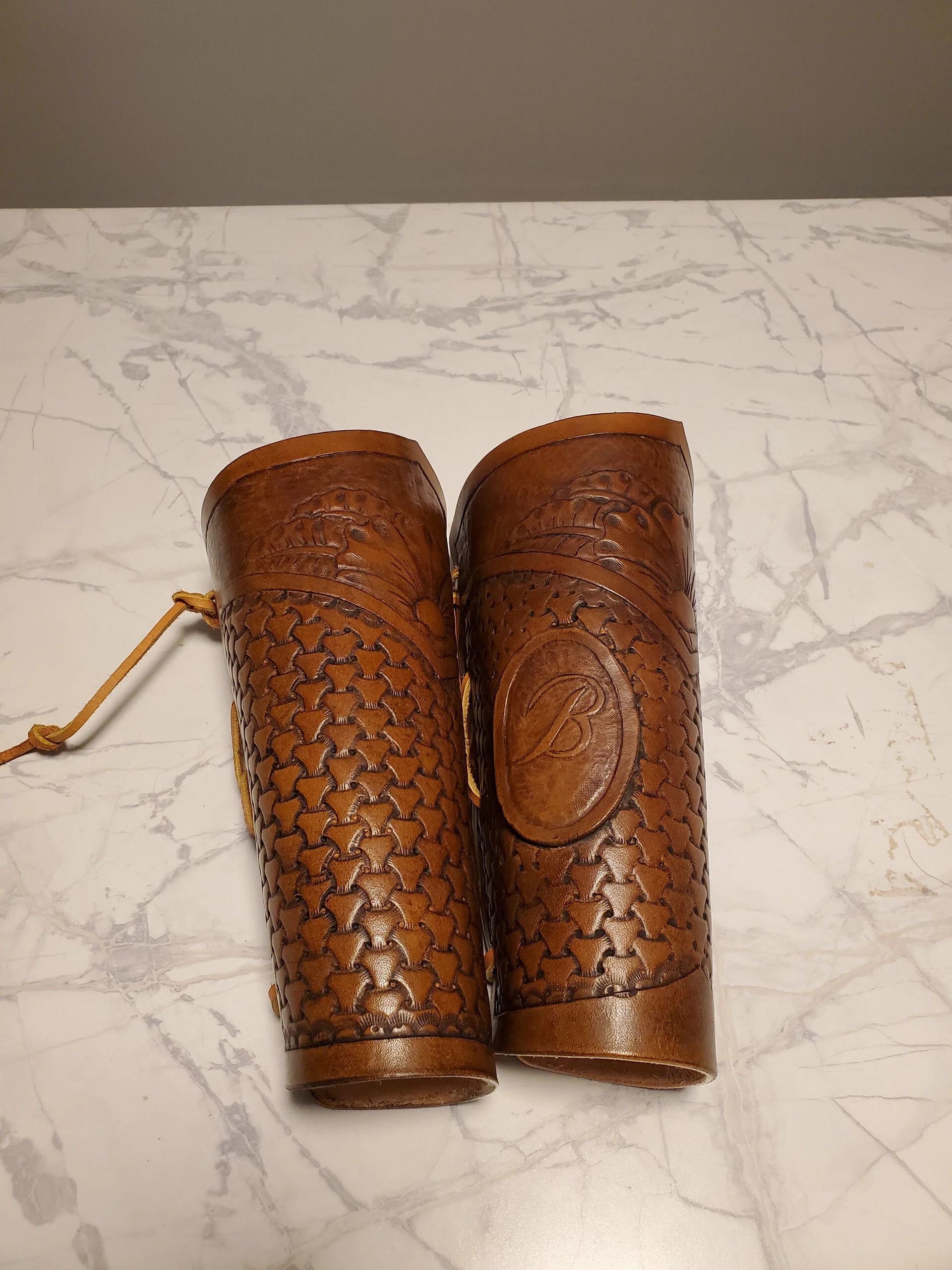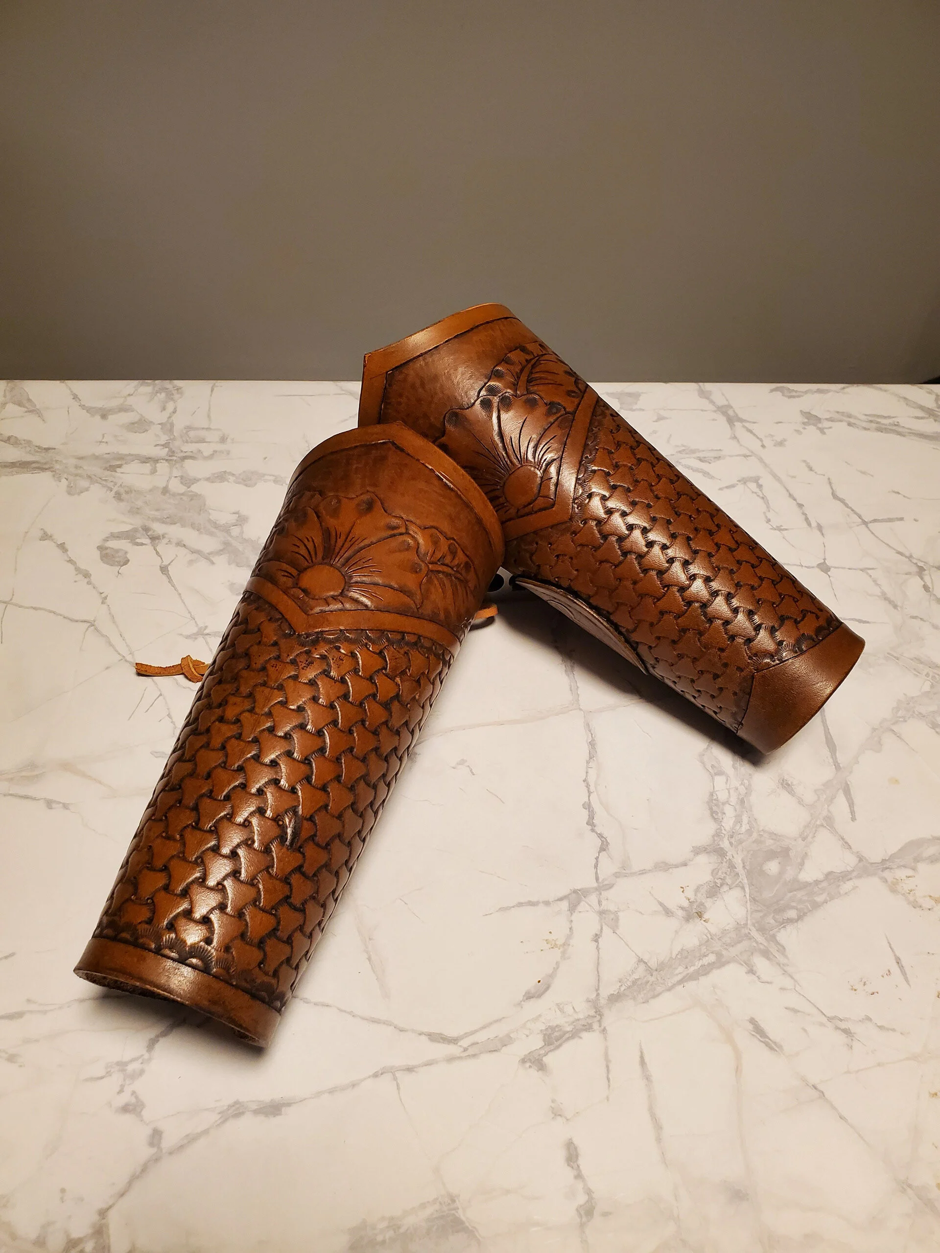 Leather Bracers made from 8oz Veg Tan Leather with floral tooling and basket weave.